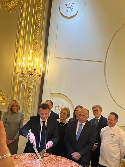 Il a pu assister à la découpe de la galette des rois (sans fève !) offerte par les Boulangers-Pâtissier au Président de la République, et rencontrer Christelle LORHO, MOF Fromager et David BAZERGUE, Délégué Général de la FFF.